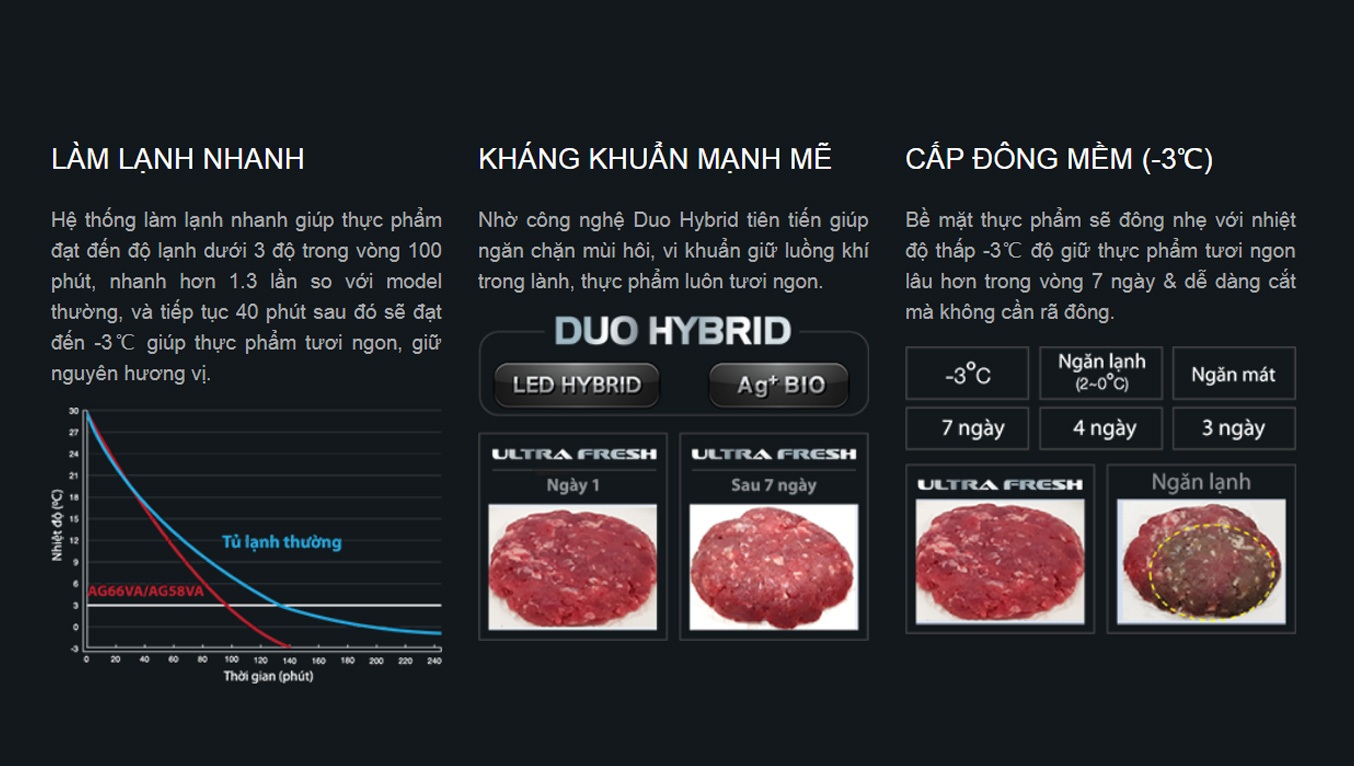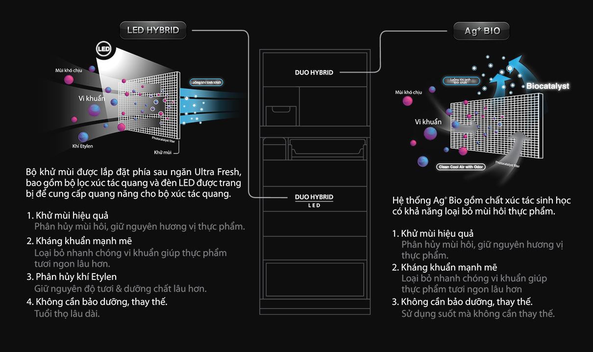 | KHÁNG KHUẨN KHỬ MÙI | Hệ thống Duo Hybrid khử mùi kháng khuẩn ở cả ngăn mát và ngăn đôngKhử mùi tăng cường ở ngăn đông |